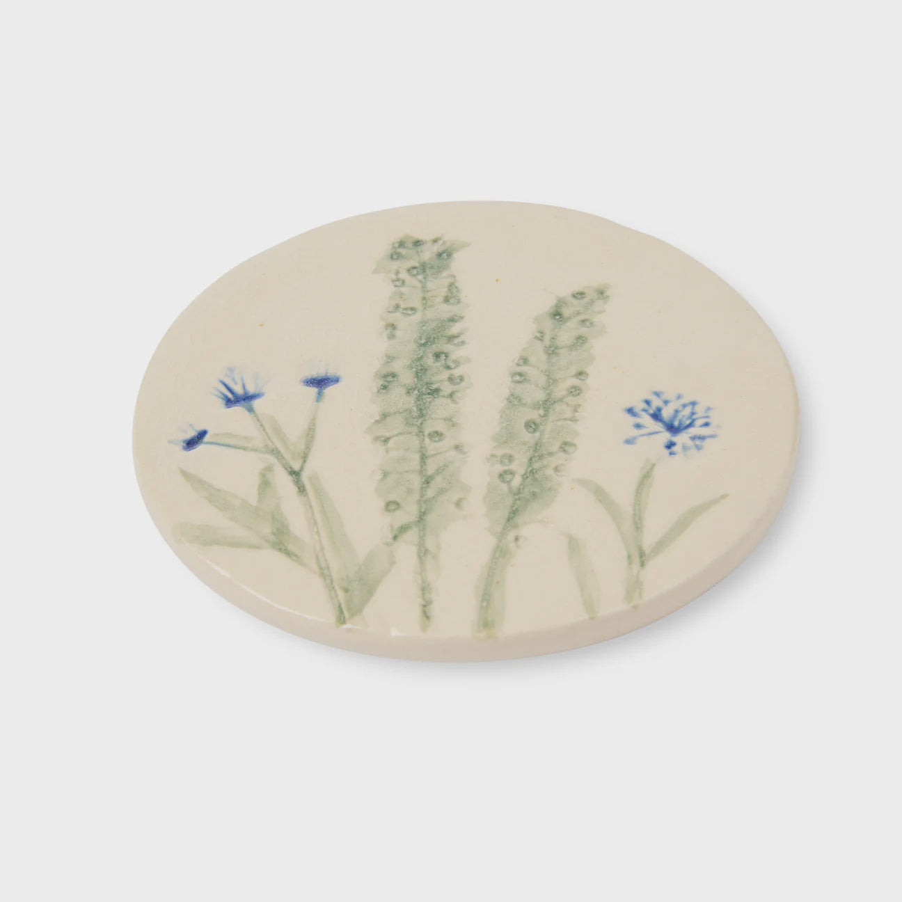 Natural coloured single ceramic coaster with hand-painted botanical design.