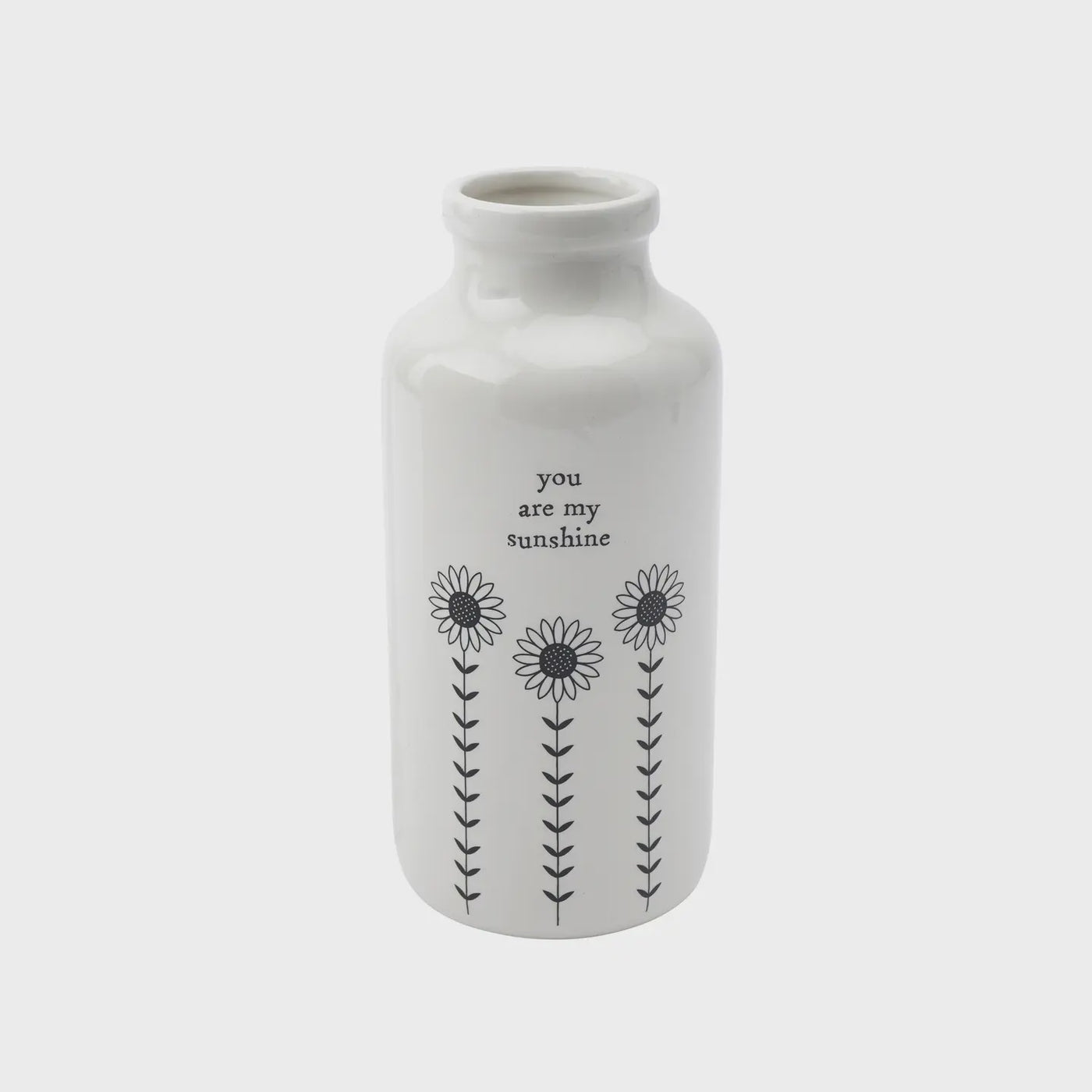 The delicate floral design, handcrafted onto the ceramic surface, breathes life into this charming bud vase. Complemented by the heartfelt slogan, "You Are My Sunshine" this vase becomes a thoughtful and sentimental gift for cherished friends. To enhance the gifting experience, we present this White Ceramic Bud Vase in a beautifully crafted gift box.