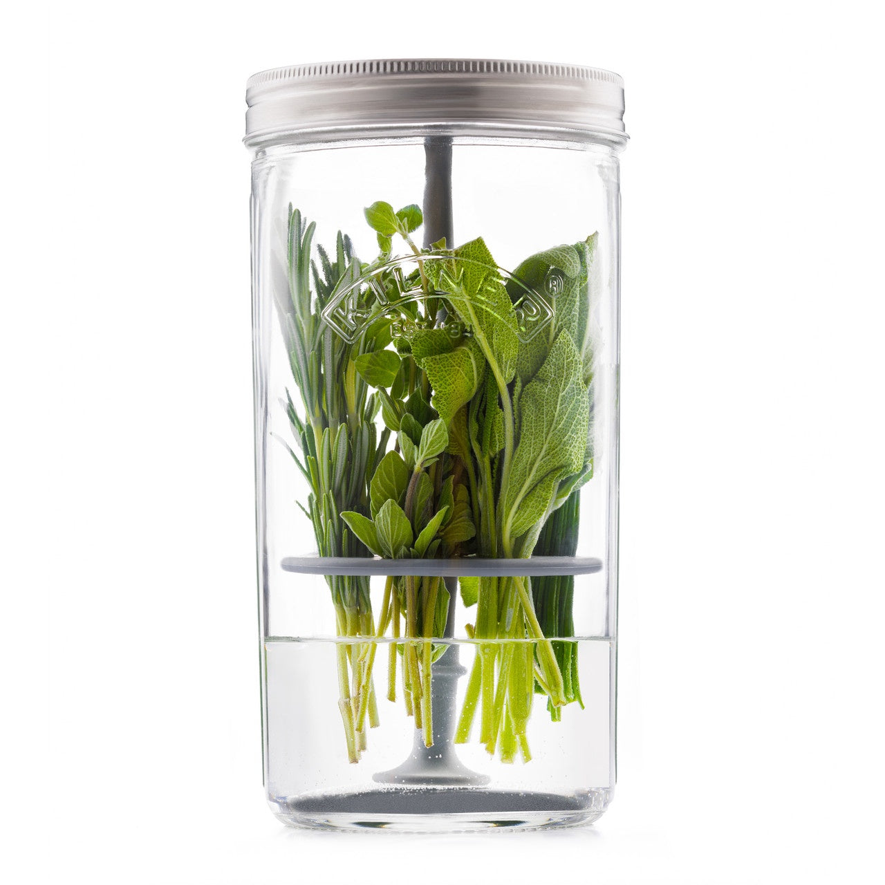 Keep fresh grown or store-bought herbs fresher for longer, for up to 3 weeks, with this easy-to-use Herb Keeper Set. Stemmed herbs such as basil, parsley, mint and coriander last longer when stored in a container with their stems in water. The unique design includes a silicone rod and circular disc containing different hole sizes to accommodate a variety of herb stems, maintaining an upright position. Designed to be kept in the fridge, or on the kitchen countertop out of direct sunlight, this Herb Keeper is perfect for keeping herbs fresh and ready to use, with less waste. A step-by-step booklet is included in the set with illustrated instructions and suggested recipes.