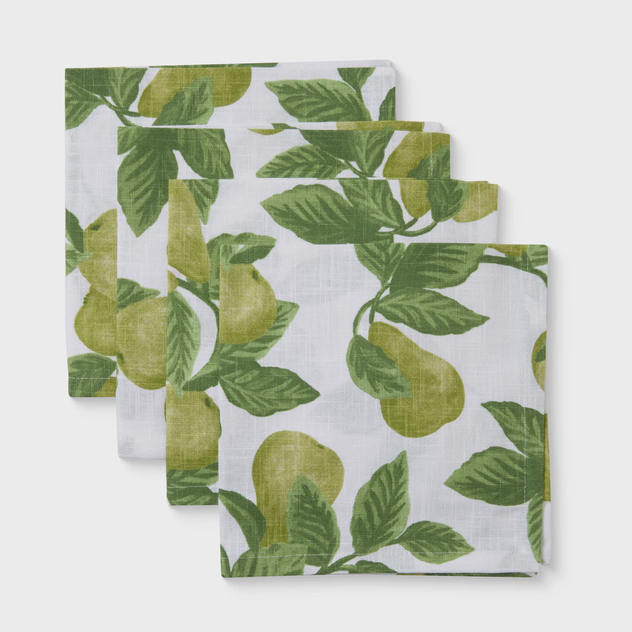 Napkin set of 4 green pears design printed on white cotton slub.