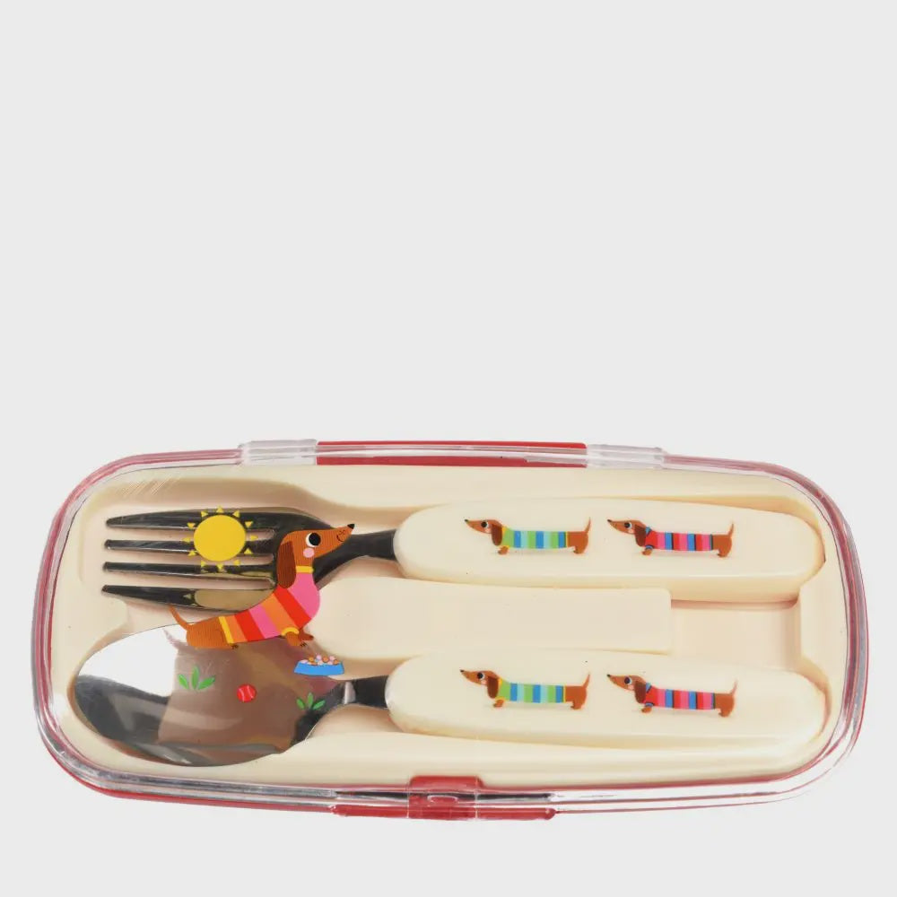 Rex London Child Cutlery Set - Sausage Dog: Mealtime fun with a dash of dachshund charm! Make every bite a tail-wagging treat with the Rex London Child Cutlery Set – Sausage Dog!