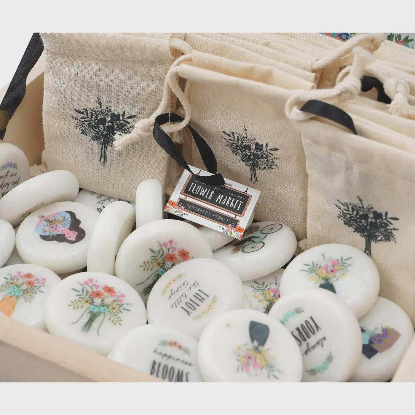 Whether you're seeking a thoughtful gift for a friend or loved one, or simply looking to infuse your own space with positivity, our Wooden Box of Assorted Round Pebbles is the perfect choice. Each pebble comes nestled in its own fabric gift bag, adding an extra layer of charm.