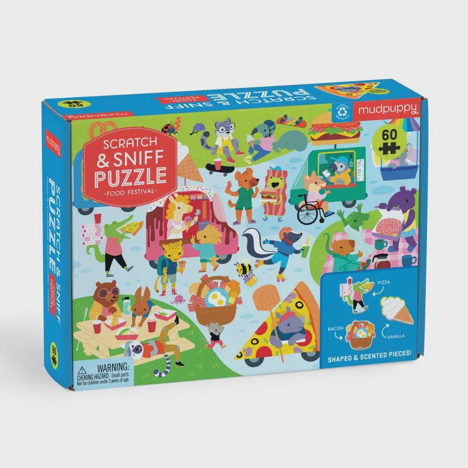 Mudpuppy Scratch Sniff 60-Piece Puzzle – Food Festival: A Scented Puzzle Adventure! Product Description: Engage the senses with Mudpuppy’s Food Festival Scratch Sniff Puzzle! This unique 60-piece puzzle includes six scented, food-themed pieces, adding a fun twist to traditional puzzling. Made with recycled materials, the Food Festival puzzle is a delightful way for kids aged 4 and up to enhance their sensory play experience while building fine motor skills.